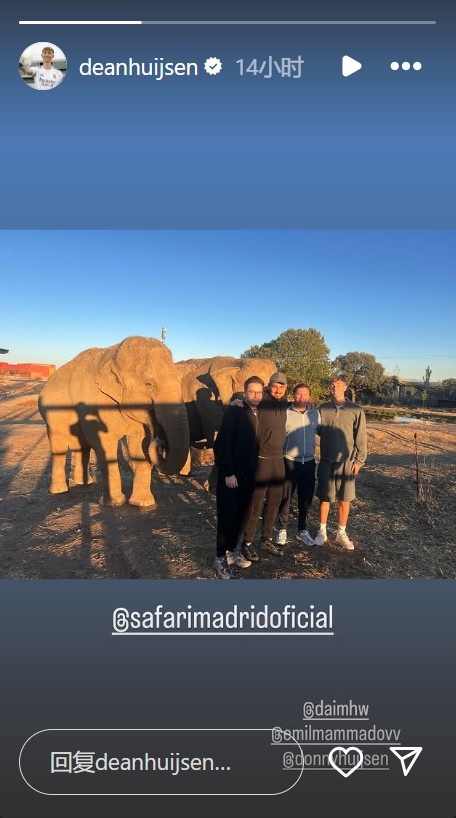 当地时间周一,皇马后场球员赫伊森与亲友前往马德里野生动物园游览,欧洲杯直播吧他在个人社媒晒出与大象的合照。