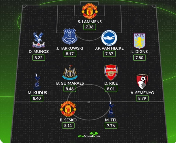 中场球员:库杜斯(热刺)、吉马良斯(纽卡)、赖斯(阿森纳)、塞梅尼奥(伯恩茅斯)