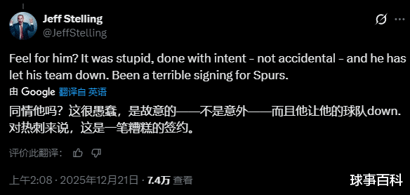 然而,前天空体育主持人、现任talkSPORT主持人的斯特林并不打算为这位22岁的球员说话。一位球迷表示为西蒙斯感到难过,欧洲杯直播斯特林在X上回应道:“为他感到难过?那动作很愚蠢,是故意的,绝非意外,他让球队失望了。对热刺来说,这是一笔糟糕的签约。”
