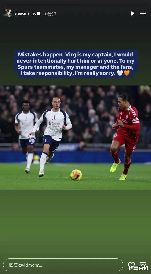 热刺与利物浦的赛事 在西蒙斯铲球前一直波澜不惊,起初主裁判 约翰·布鲁克斯只出示了警告 。但在VAR提示下,裁判 观看回放后改变了决定,向这位荷兰球员出示了驱逐 。赛后,西蒙斯在Instagram上表示,他绝无意伤害对手,并向范戴克、队友、托马斯·弗兰克以及热刺球迷道歉。