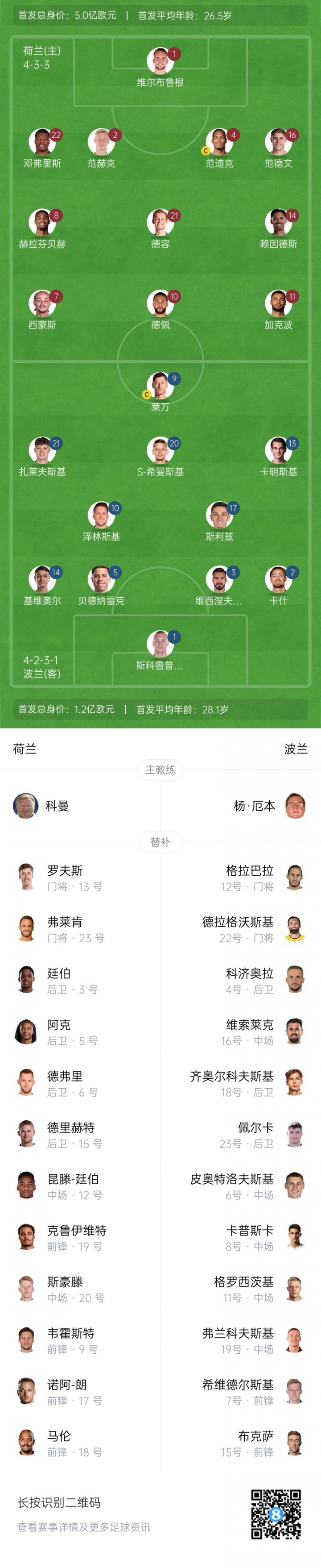 荷兰vs波兰杆位:莱万PK德佩,加克波、赖因德斯、德容先发