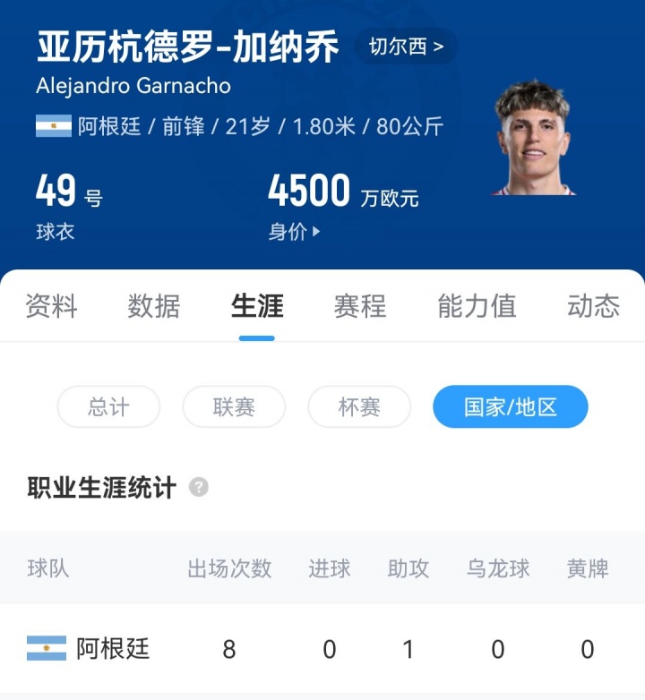 21岁的加纳乔至今为阿根廷国家队出场8次,贡献1次助功 。