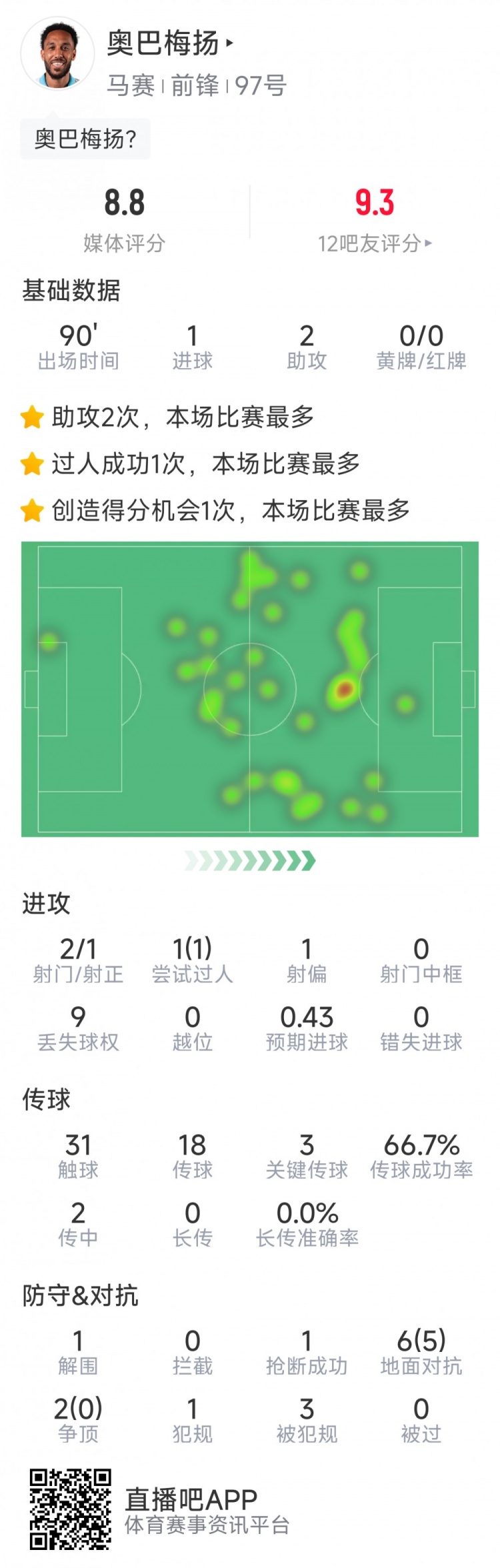 焕发第二春,奥巴梅扬本场数据:1粒得分 ,2次助功 ,3次关键传送球