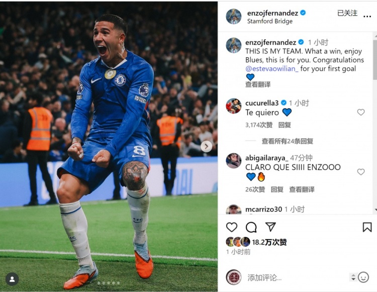 恩佐社媒:多么美妙的获胜 ,祝贺埃斯特旺攻入英超首球