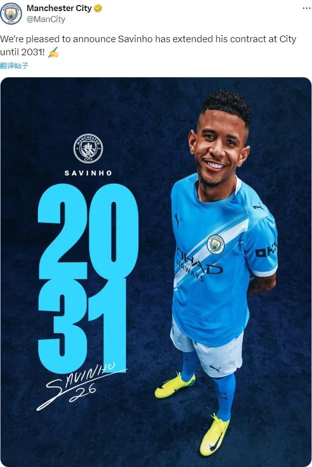 官方:曼城宣布和萨维尼奥续约到了2031年。