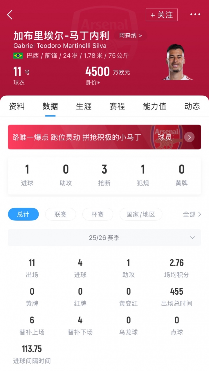 10月22日讯 本轮欧冠阿森纳主场作战 4-0完胜马竞,先发登场的马丁内利出色 推射打入球队第二球,欧冠三轮已经有三粒得分 入账,本赛季总计打入4球仅次于队友约克雷斯。
