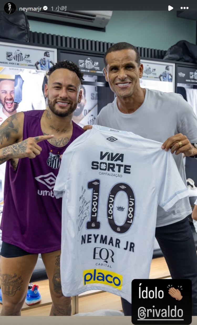 内马尔赠巴西名宿里瓦尔多签名运动活动 服 ,社媒晒合影并配文:偶像!