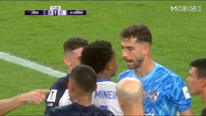 > 什么情况?米内罗十二码球破门,随后与柔佛守门员争执,两队发生冲突