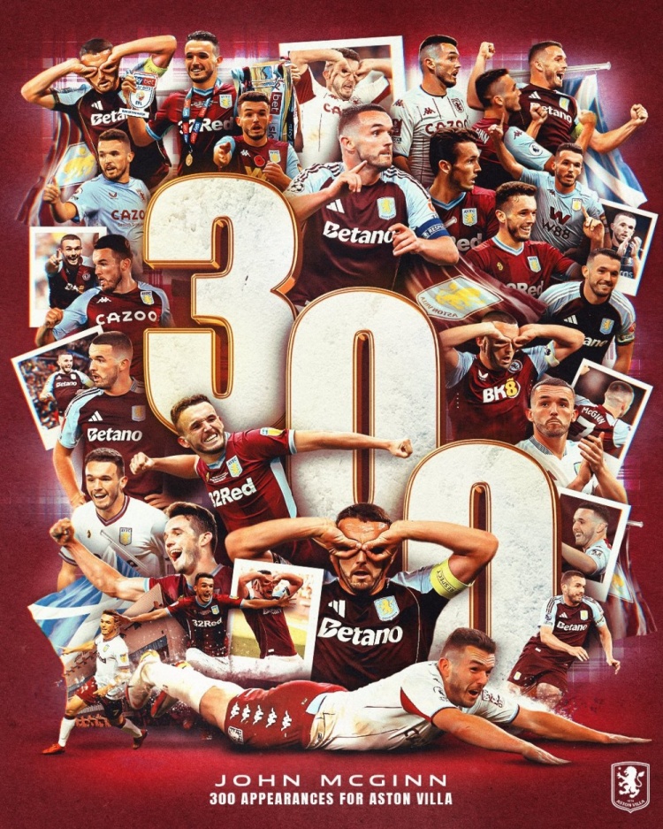 里程碑!麦金为维拉出战300场赛事 ,贡献33球41助